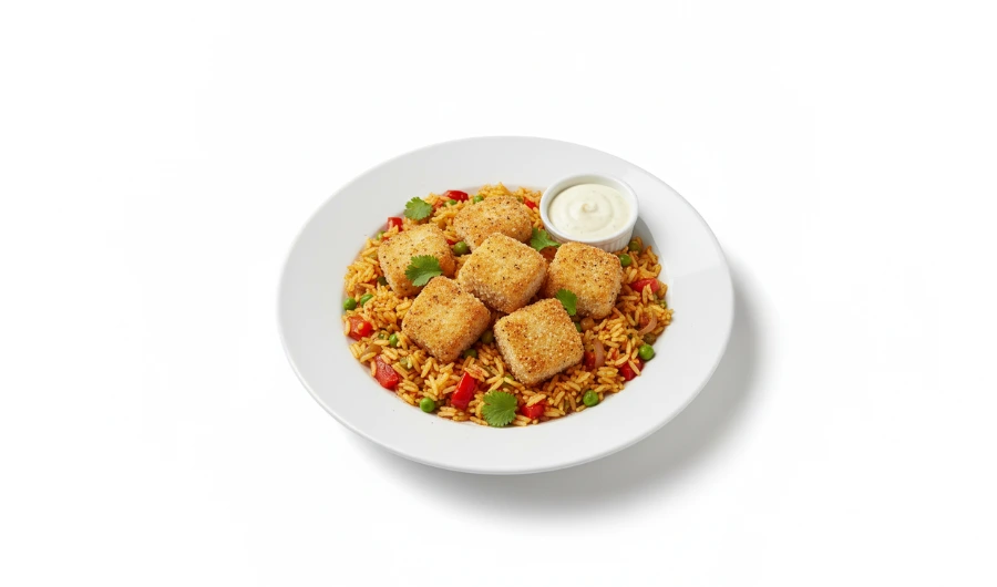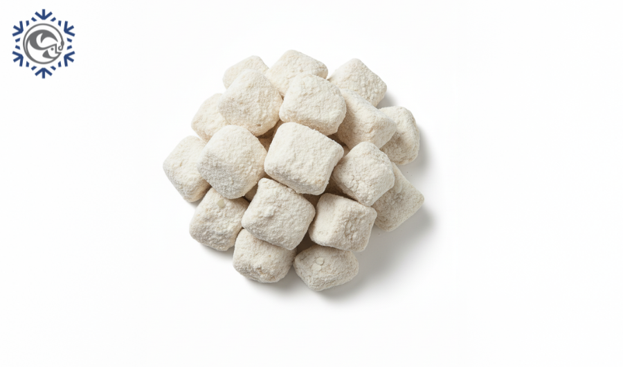Cazón en cubos adobados y enharinados (Galeorhinus galeus) Pescaland, IQF, carne firme y fresca, listo para fritura y hostelería profesional.